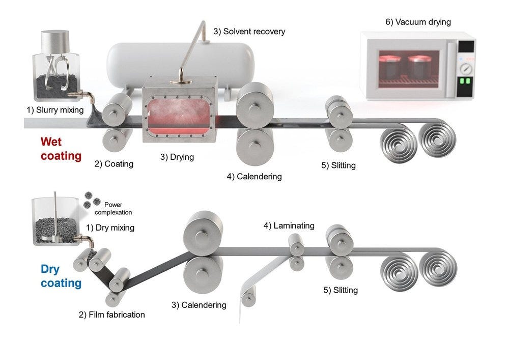 Conventional electrode coating relies on liquid solvent-based slurries (i.e., wet process or coating) and massive drying ovens to evaporate said solvents after coating (Figure 3). By using a dry powder-to-film process (i.e., dry process or coating), Tesla aimed to eliminate solvents, cut factory footprint tenfold and lower energy consumption.