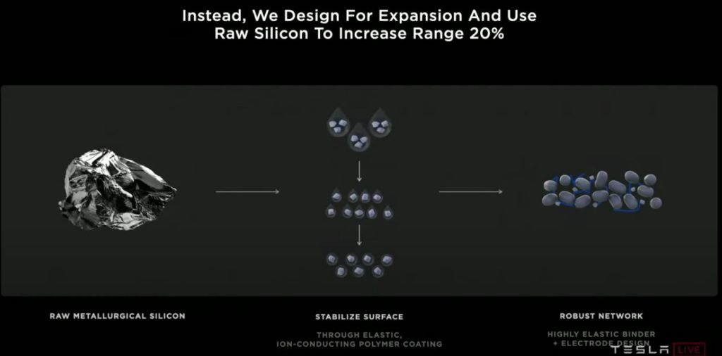 To boost energy density, Tesla proposed replacing most graphite with raw metallurgical silicon, which would help increase the range by 20% at a cost of only 1.20 USD/kWh of anode material. Since silicon changes its volume by up to 400% during charge-discharge cycles, its particles crack and lose electrical contact with each other. To mitigate this, Tesla proposed wrapping silicon in an ion-conductive polymer and using ‘‘elastic’’ binders (Figure 4).